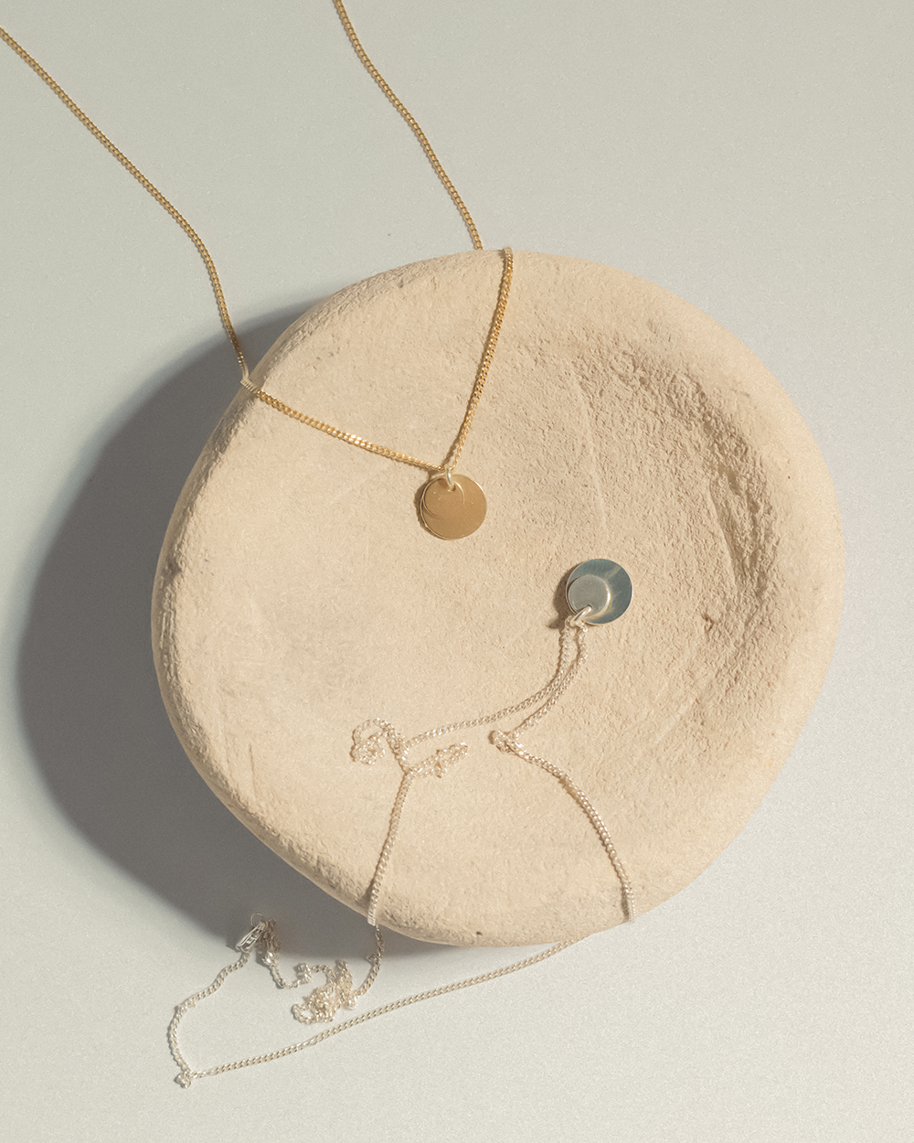 Classic curb chain necklace with two coins in 925 Sterling Silver. Thickness: 1.2 mm. Coin S: 6 mm. Coin M: 10 mm.
