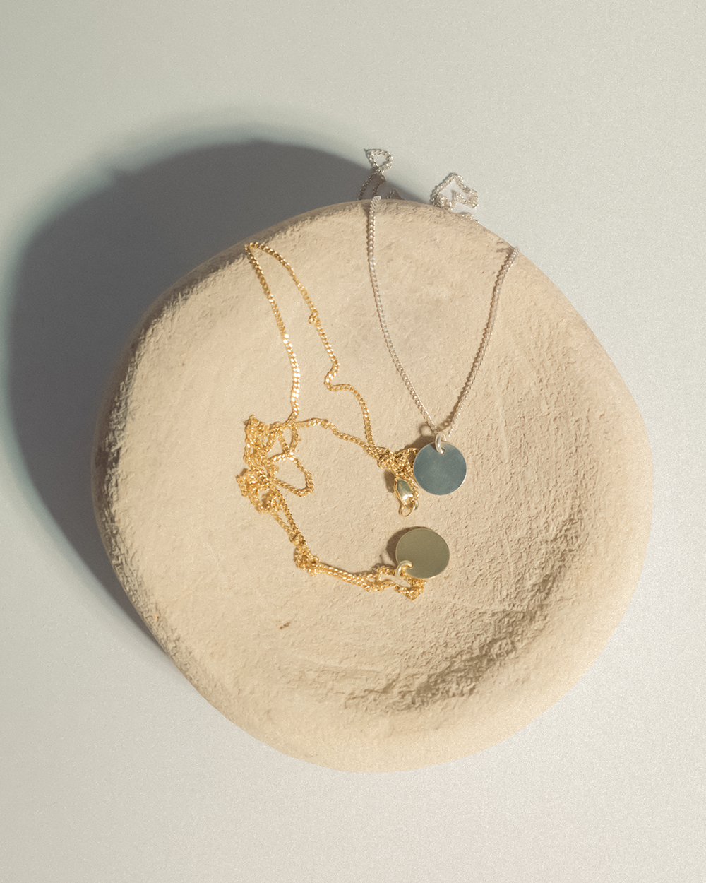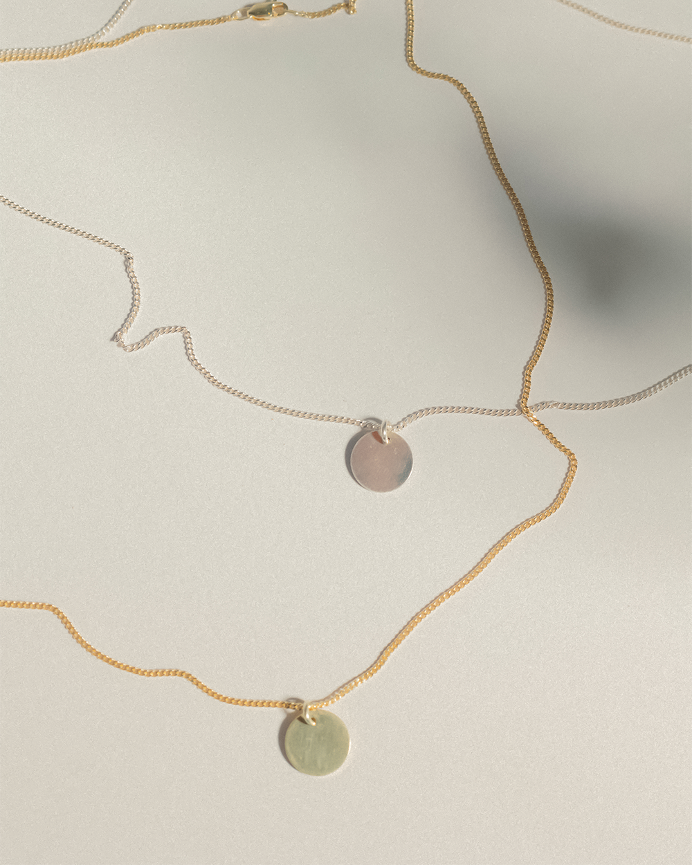 Classic curb chain necklace with one coin in gold-plated (925 Sterling Silver with a double layer of 14 karat Gold). Thickness: 1.2 mm. Coin: 10 mm.
